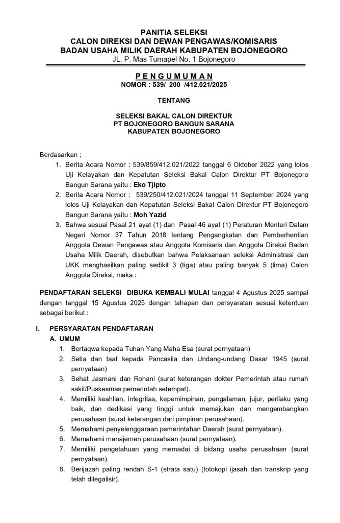 PENGUMUMAN NOMOR : 539/200/412.021/2025 TENTANG SELEKSI BAKAL CALON DIREKTUR PT BOJONEGORO BANGUN SARANA KABUPATEN BOJONEGORO