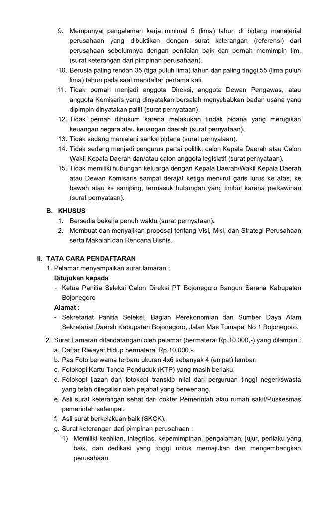 PENGUMUMAN : PENDAFTARAN SELEKSI BAKAL CALON DIREKTUR PT BOJONEGORO BANGUN SARANA KABUPATEN BOJONEGORO
