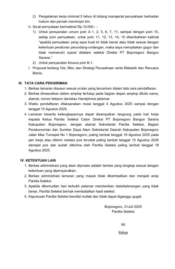 - Lamaran beserta kelengkapannya dapat disampaikan langsung pada hari kerja kepada Ketua Panitia Seleksi Calon Direktur PT Bojonegoro Bangun Sarana Kabupaten Bojonegoro, dengan alamat Sekretariat Panitia Seleksi, Bagian Perekonomian dan Sumber Daya Alam Sekretariat Daerah Kabupaten Bojonegoro Jalan Mas Tumapel No 1 Bojonegoro, paling lambat tanggal 10 Juni 2024 pada jam kerja atau dikirim melalui pos tercatat paling lambat tanggal 10 Juni 2024 stempel pos dan sudah diterima oleh Panitia Seleksi paling lambat tanggal 11 Juni 2024.